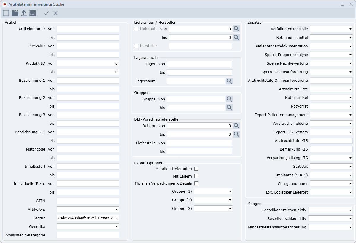 Mit der erweiterten Suchfunktion haben Sie die Möglichkeit über die meisten Felder des Artikelstammes gezielt zu suchen.