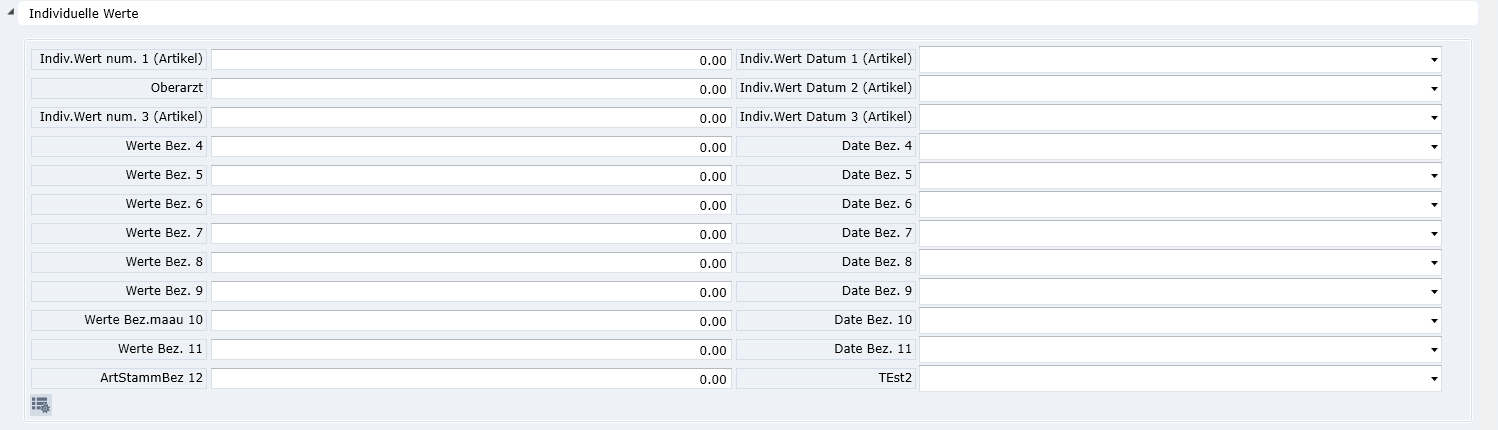Das Register Individuelle Werte ist rein informativ und übernimmt im Materialmanagement keine weiteren Funktionen. Es stehen Ihnen 12 Felderpaare zur Verfügung, die Sie für Ihre Zwecke nutzen können. Jedes der 12 Feldpaare besteht aus einem Numerischen- und einem Datumsfeld.