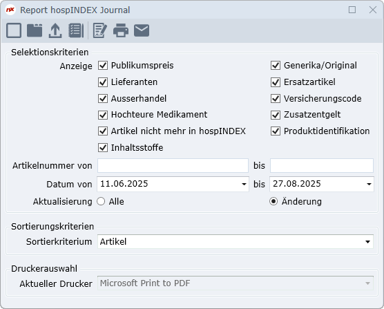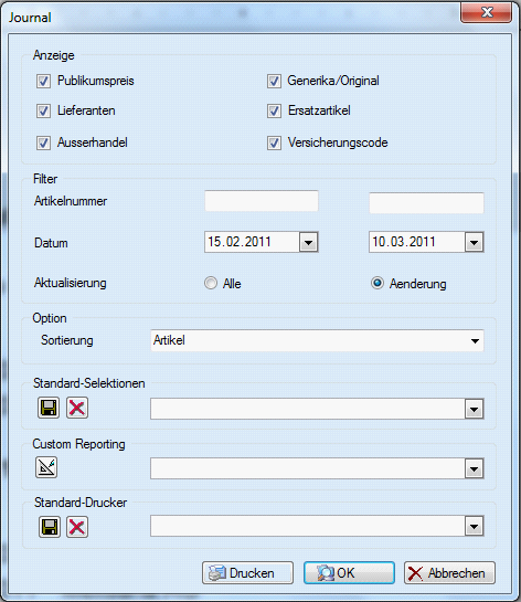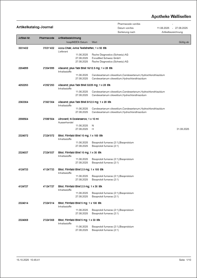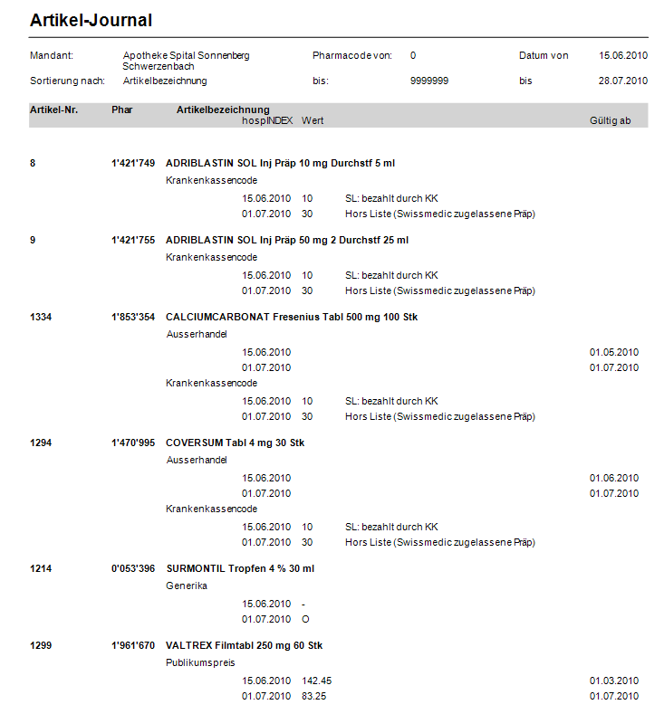 Dieses Journal gibt Auskunft über Änderungen, z.B. Ausser Handel, Ersatzartikel oder Wechsel von Versicherungscodes. Es wird empfohlen, dieses Journal nach jedem Datenupdate und Datenaktualisierung zu erstellen. Damit ggf. entsprechende Massnahmen eingeleitet werden können (z.B. Versicherungscode-Wechsel hat Auswirkung auf die Abrechnung in der Patientenadministration).