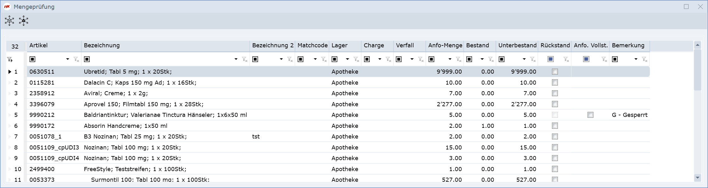 Lager | Selektion nach Lagerort, z.B. Apotheke, Zentrallager, etc. |