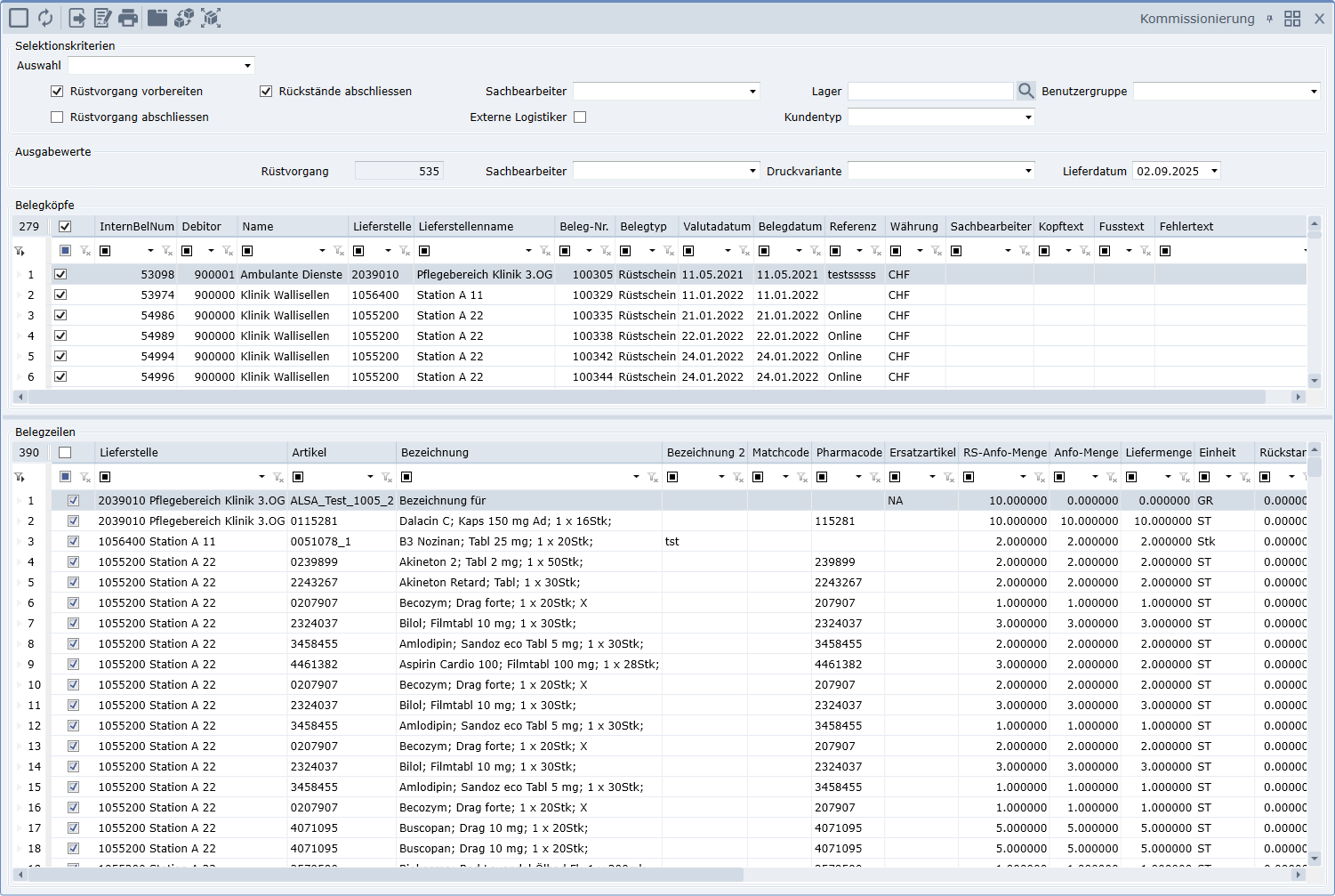 Mit diesem Programm können Sie alle offenen Rüstscheine zusammen bearbeiten und in Lieferscheine (oder Rechnungen für externe Debitoren) übernehmen. Das Kommissionieren erfolgt in 2 Schritten. Rüstscheine müssen i.d.R. nicht manuell erfasst werden, sondern werden z.B. über die Online-Anforderung in das Materialmanagement übermittelt.