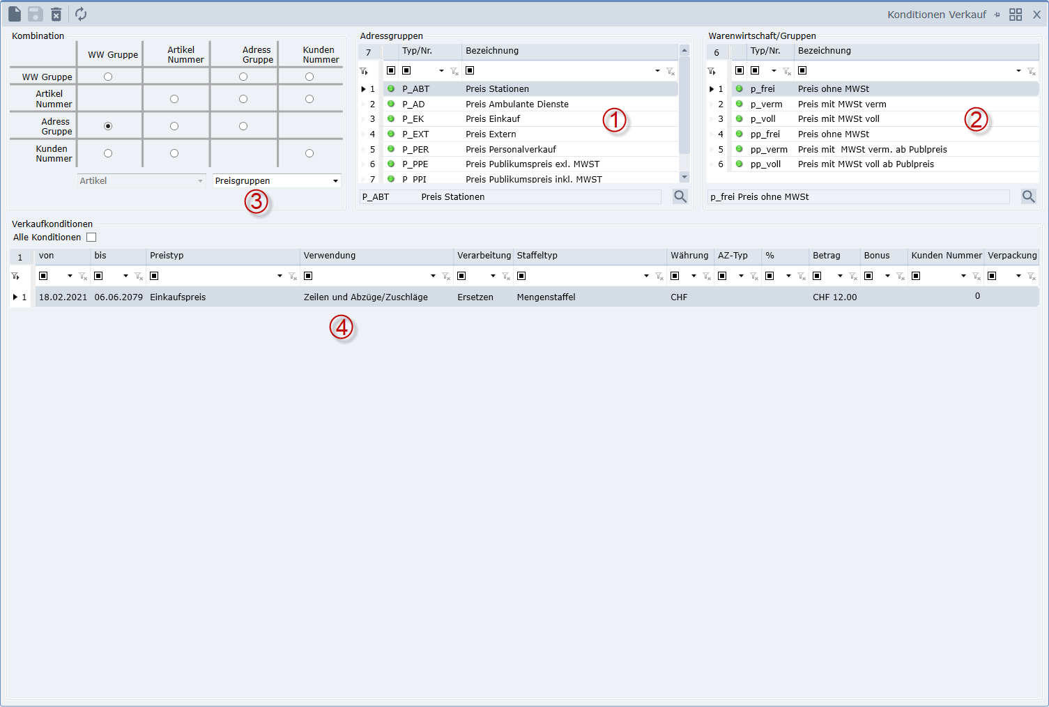 Mit dieser Funktion werden die Verkaufs-Konditionen hinterlegt. Die Pflege der Konditionen erfolgt pro MatMan-Mandat. Im linken Teil, unter Kombination, wird Ihnen eine Matrix angezeigt, mit der verschieden Kombinationen zur Formelhinterlegung angeboten werden. Für die Verkaufs-Formeln wird aber i.d.R. die Kombination Adress- und Warenwirtschaft-Gruppe gewählt, deswegen wird diese als Default vorgeschlagen. Die folgende Erklärung beschränkt sich auf diese Kombination.