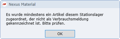 Wird ein Artikel einem Stationslager zugeordnet, der noch nicht für die Verbrauchsmeldung aktiviert wurde (Reiter Zusätze), so erscheint dieser Warnhinweis.