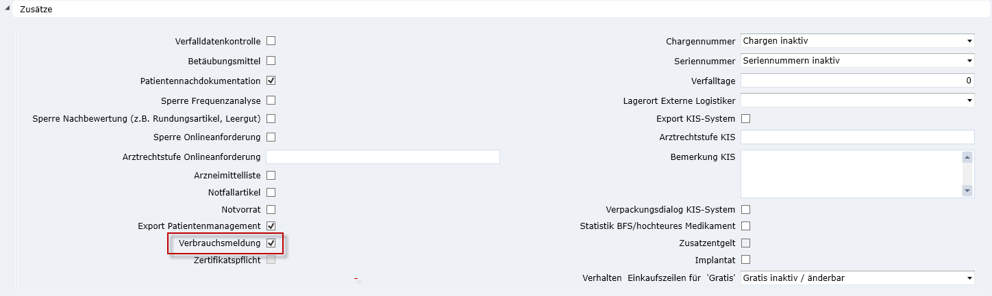 Damit Verbrauchsmeldungsätze vom Patientenmanagement an das Materialmanagement übergeben werden können, müssen die Artikel für die Verbrauchsmeldung gekennzeichnet werden. Dieses Kennzeichen wird mit dem Leistungsstammimport (pat02) an Patientenmanagement übergeben.