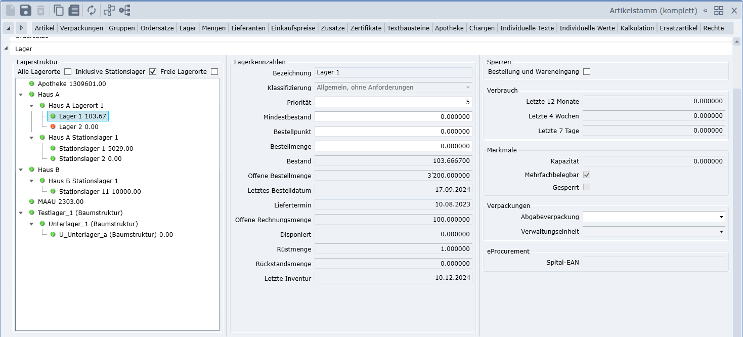 - Damit im Tagesgeschäft die Übersichtlichkeit erhalten bleibt, können die Stationslager wahlweise durch Setzen des Häkchens bei "inkl. Stationslager" ein- bzw. ausgeblendet werden.