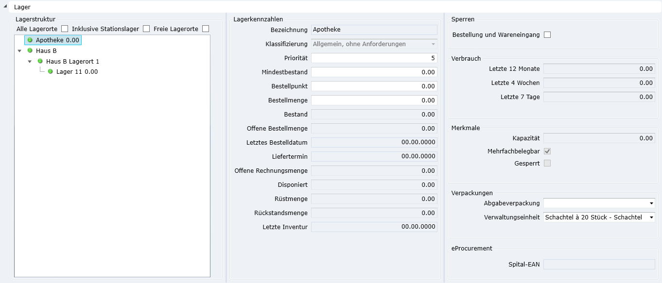 | Spital-EAN | GLN Nummer, welche in den Lagerstammdaten hinterlegt ist. Wird für die eBestellung verwendet. |
