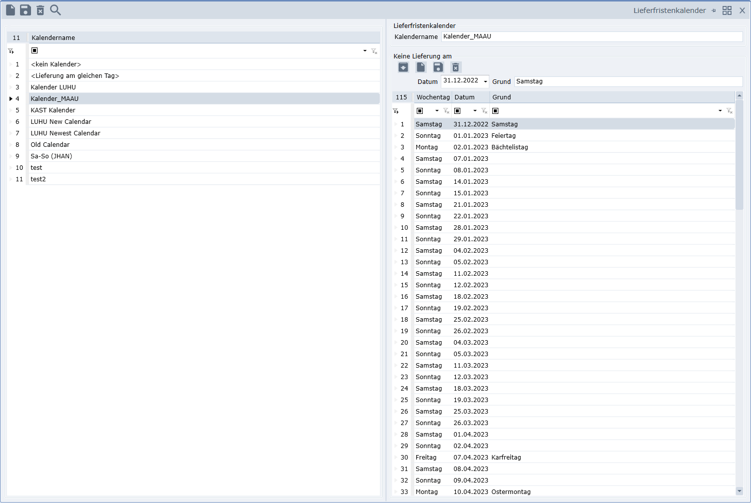 Mit NEU kann ein neuer Lieferfristenkalender manuell angelegt werden.