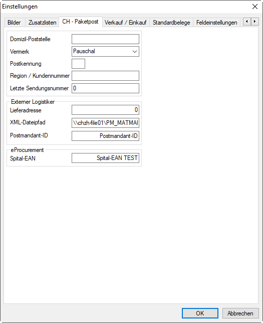 Die administrativen Vorgaben für die Datenübermittlung resp. den Andruck der Paketpost-Etiketten können in diesen Einstellungen hinterlegt werden. Um den Bereich der Paketpost mit den Sendungsetiketten einsetzen zu können müssen folgende Bedingungen erfüllt sein: