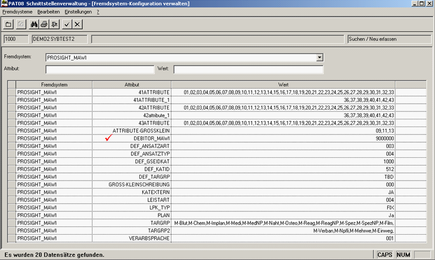 Wird nur eine MatMan-Debitornummer verwendet, so kann diese mit dem Attribut «Debitor_MAWI» z.B. 9000000 in der Bildschirmmaske «Fremdsystem-Konfiguration verwalten» hinterlegt werden, diese dient dann für sämtliche MatMan-Lieferstellen als Standard.