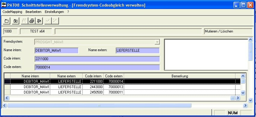 Genügt hingegen die Hinterlegung einer einzigen MatMan-Debitornummer nicht, so kann mit der Bildschirmmaske «Fremdsystem-Codeabgleich verwalten» weitere Zuordnungen der Art «Lieferstelle / Debitorennummer» festgelegt werden. Eine so festgelegte Zuordnung übersteuert den Standardwert.