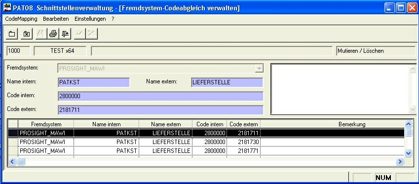Wenn allerdings x-MatMan-Lieferstellen zu einer PatMan-Leistungsstelle gemappt werden sollen. Dann erfolgt der Eintrag anstatt im pat10 - Kostenstellenverwaltung nur im pat08 - Schnittstellenverwaltung in der Bildschirmmaske «Fremdsystem-Codeabgleich verwalten». Dies kann vorkommen, wenn im MatMan z.B. mehrere Lieferstellen aus Statistikgründen geführt werden, die im PatMan allerdings unerwünscht sind: