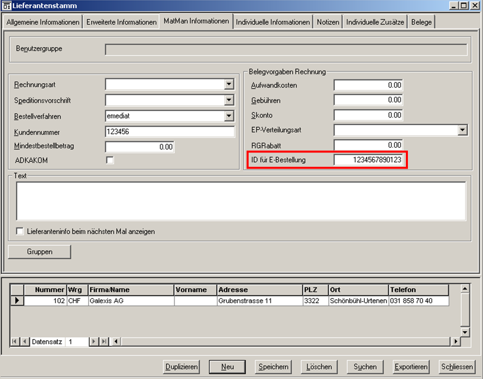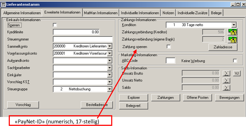 Die PayNet Identifikationsnummer (wird von PayNet vergeben) soll im Lieferantenstamm auf dem Reiter «Erweiterte Informationen» hinterlegt werden. (XML: >Biller >Party ID «pid»)