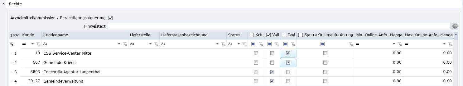 im Spaltenkopf. Sollen nicht alle, aber jedoch mehrere Lieferstellen markiert werden, so halten Sie die Taste CTRL gedrückt und markieren die gewünschten Datensätze mit einem Mausklick. Wenn man nebst der CTRL Taste ebenfalls die Shift Taste drückt, kann man mit einem Klick mehrere Spalten auswählen. Wenn alle gewünschten ausgewählt sind, kann man mithilfe des Betätigen der Leertaste, alle Checkboxen selektieren.