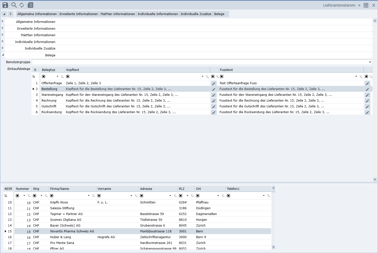 Hiermit haben Sie die Möglichkeit Kopf- und/oder Fusstexte für die verschiedenen Belegtypen zu hinterlegen. Diese werden bei Belegerfassung automatisch ermittelt und angedruckt, sofern im Report aktiv.