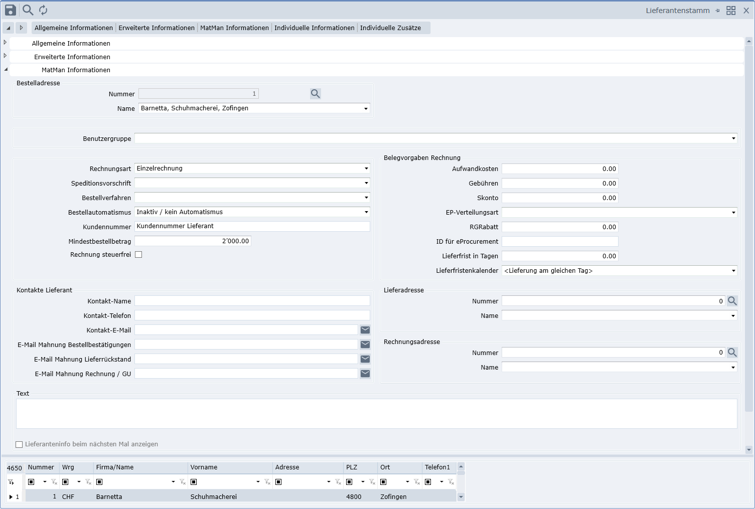 Auf diesem Register haben Sie die Möglichkeit mandantenabhängig Informationen zu hinterlegen, wie z.B. Mindestbestellbetrag, Rechnungsrabatt, freie Textinformation oder Kundennummer beim Lieferanten.
