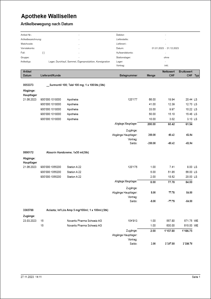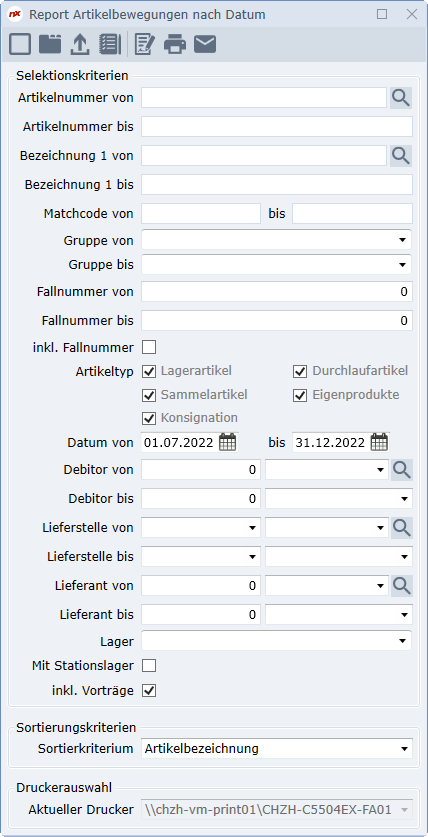 NEXUS / MATERIAL NEXUS / MATERIAL - Handbücher Handbuch MATERIAL NX Auswertungen Reports Warenwirtschaft Current: Report Artikelbewegungen nach Datum Report Artikelbewegungen nach Datum Feldgruppe / FeldnameBeschreibungSelektionskriterienArtikelnummerBereich von – bisBezeichnung 1Bereich von – bisMatchcodeBereich von – bisGruppeBereich von – bisFallnummerBereich von – bisinkl. Fallnummer inkl. / ohneArtikeltypAuswahl der Artikeltypen inkl. / ohneDatumBereich von – bisDebitorBereich von – bisLieferstelleBereich von – bisLieferantBereich von – bisLagerAuswahl eines LagersMit Stationslager inkl. / ohneinkl. Vorträgefelder inkl. / ohneSortierungskriterienSortierkriteriumAuswahl zwischen Artikelbezeichnung und ArtikelnummerDruckerauswahlAktueller DruckerAnzeige des aktuellen DruckersBeispiel: ×