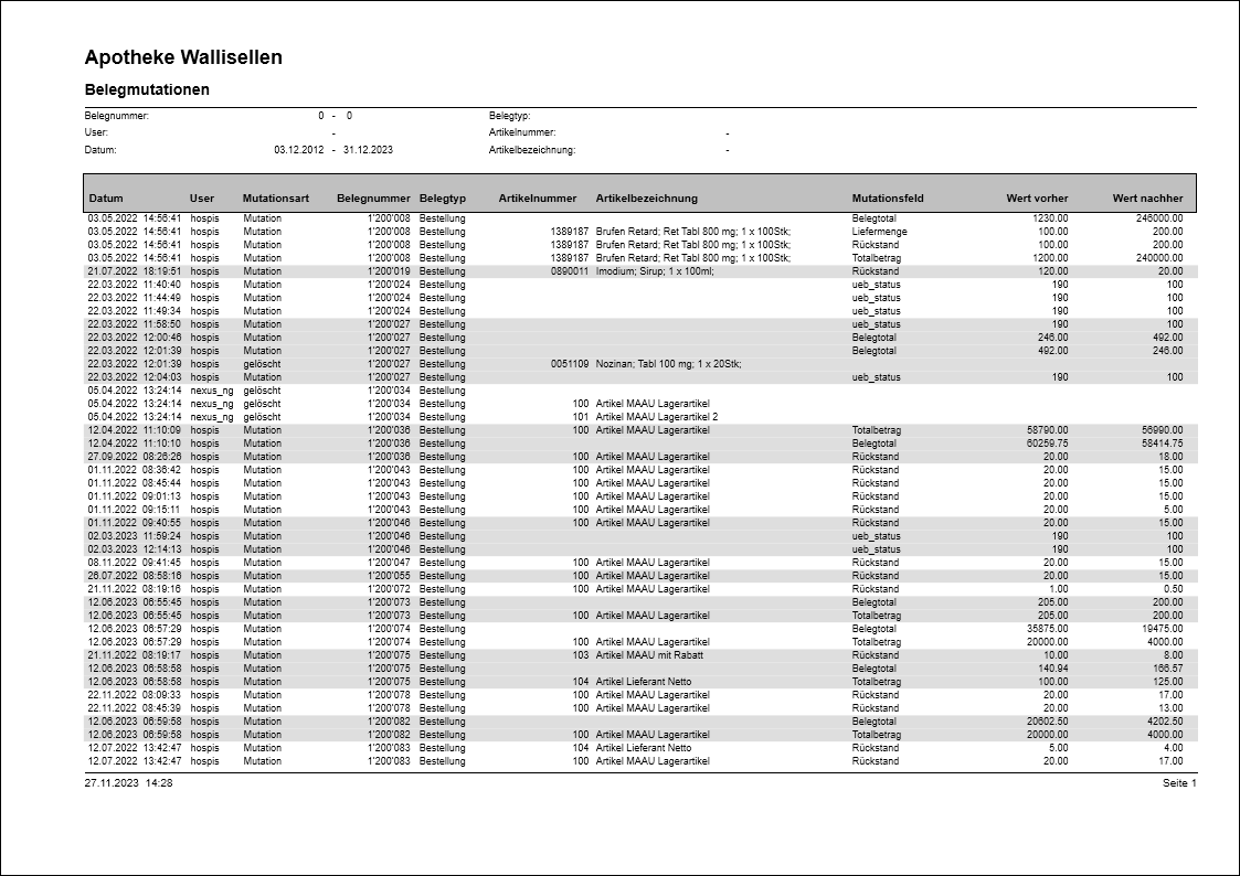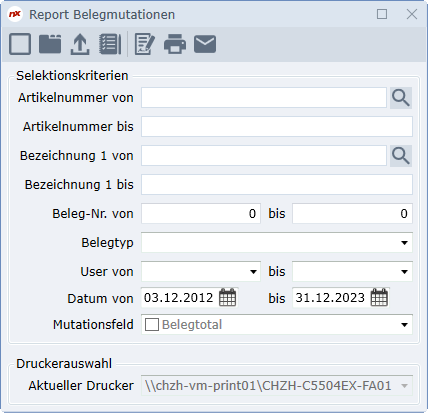NEXUS / MATERIAL NEXUS / MATERIAL - Handbücher Handbuch MATERIAL NX Auswertungen Reports Warenwirtschaft Current: Report Belegmutationen Report Belegmutationen FeldnameBeschreibungSelektionskriterienArtikelnummerBereich von – bisBezeichnung 1Bereich von – bisBeleg-Nr.Bereich von – bisBelegtypAuswahl eines BelegtypsUserBereich von – bisDatumBereich von – bisMutationsfeldAuswahl der Mutationsfelder inkl. / ohne DruckerauswahlAktueller DruckerAnzeige des aktuellen DruckersBeispiel: ×