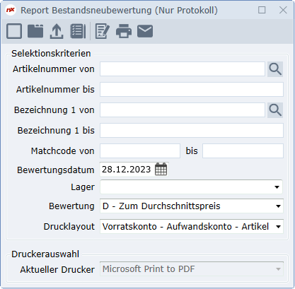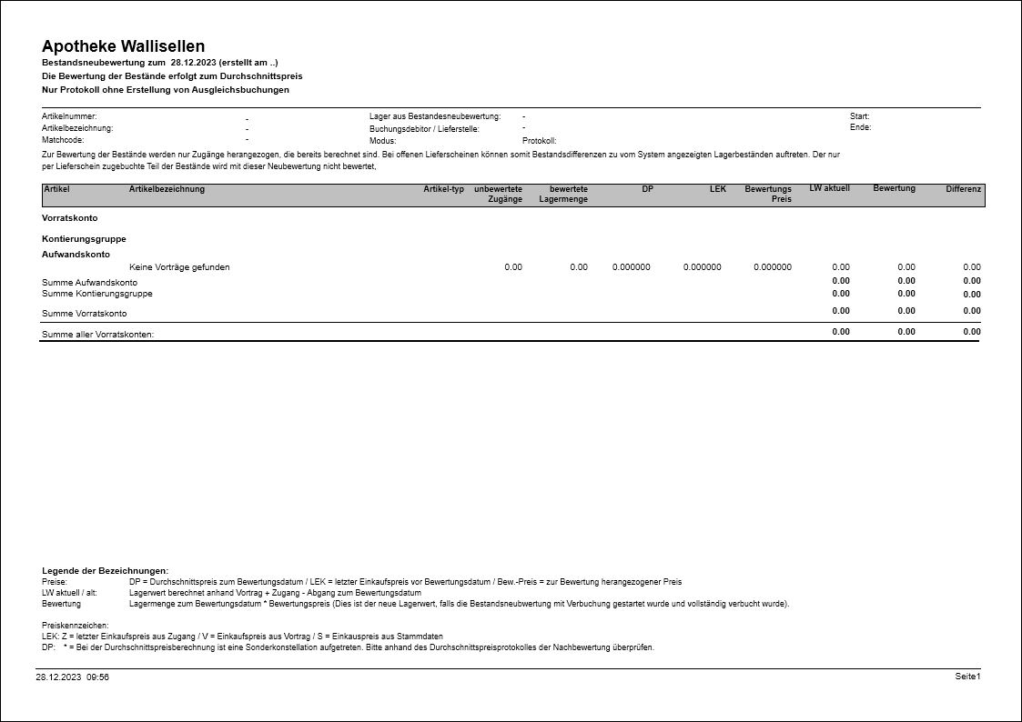 Bewertungsdatum | Stichtag zu wann die Lagerbewertung erfolgen soll. Datum per wann «Neubewertungs»-Belege erstellt werden. |