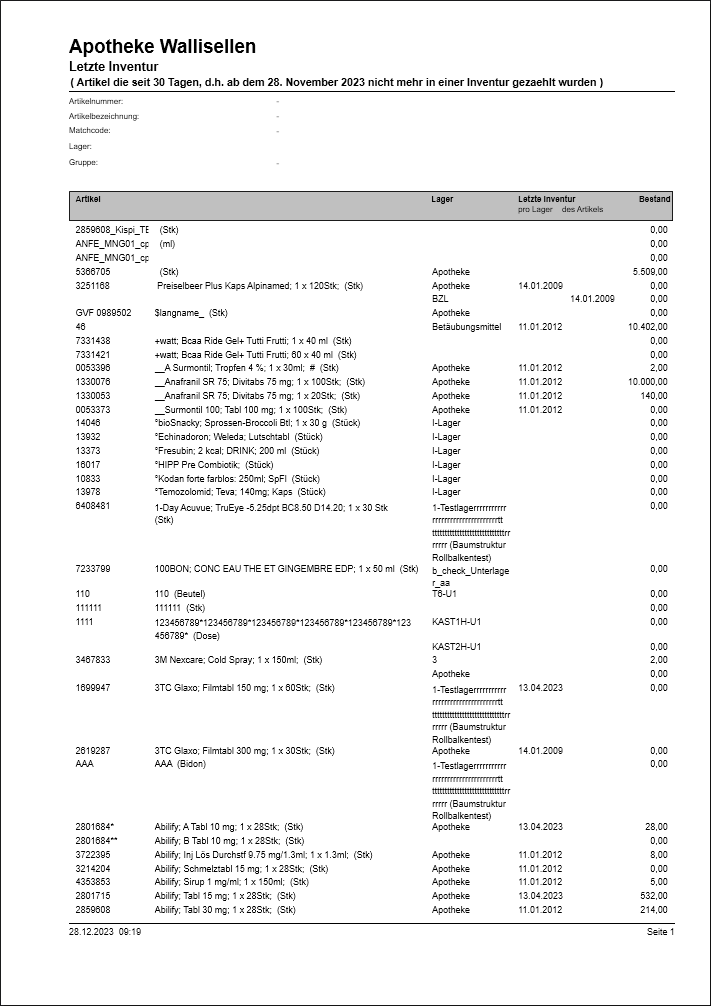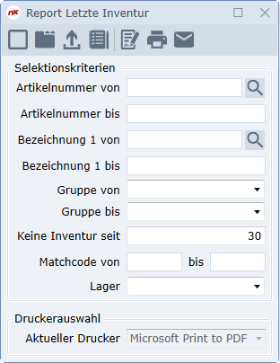 NEXUS / MATERIAL NEXUS / MATERIAL - Handbücher Handbuch MATERIAL NX Auswertungen Reports Inventur Current: Report Letzte Inventur Report Letzte Inventur Feldgruppe / FeldnameBeschreibungSelektionskriterienArtikelnummerBereich von – bisBezeichnung 1Bereich von – bisGruppeBereich von – bisKeine Inventur seitAnzahl TageMatchcodeBereich von – bisLagerAuswahl eines LagerDruckerauswahlAktueller DruckerAnzeige des aktuellen DruckersBeispiel: ×