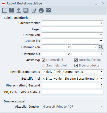 BK, LZ%, EPK% (Andler) | Parameter für die Andler-Formel (Optimale Bestellmenge): BK: Bestellkosten pro Bestellung LZ%: Lagerzinssatz (in Prozent) EPK%: Erwartete Preisänderungskosten (in Prozent)