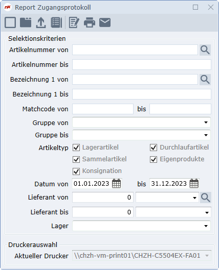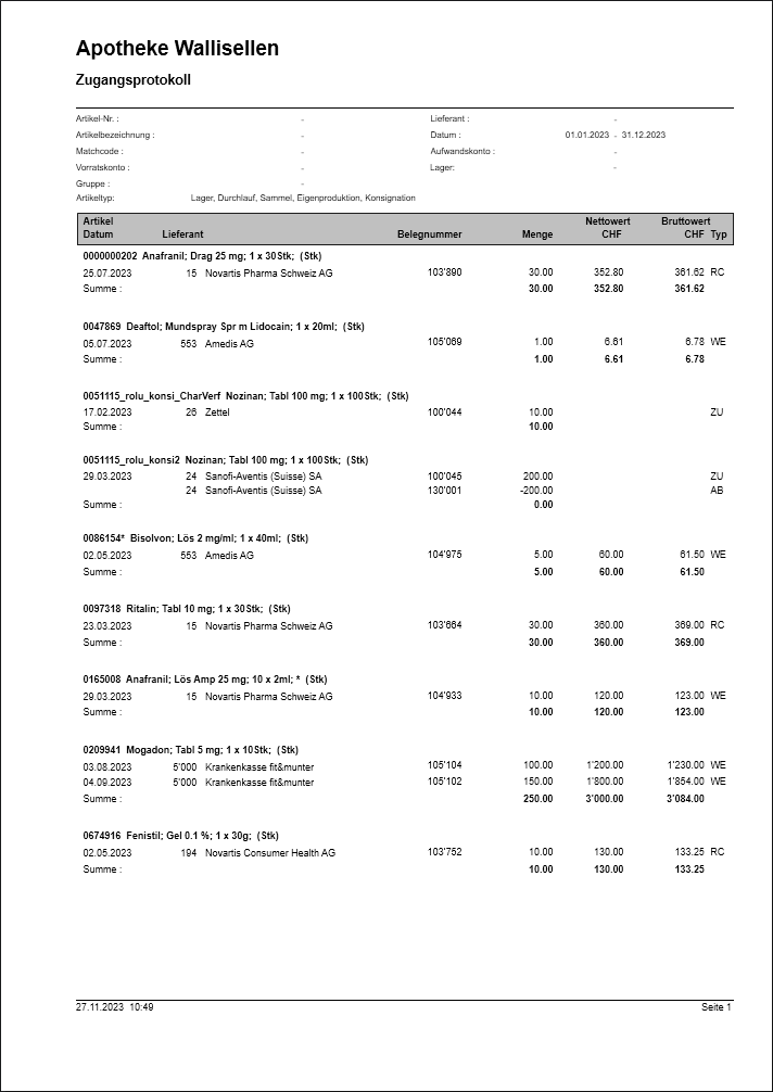 Das Zugangsprotokoll gibt Auskunft über die Zugänge ins Lager während der selektierten Periode.