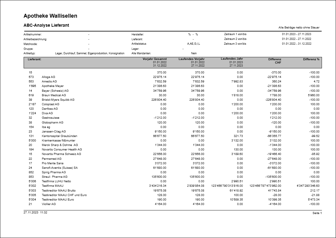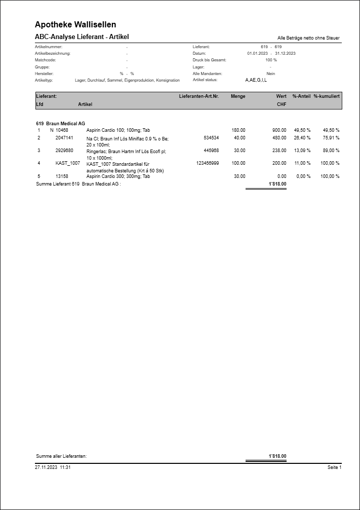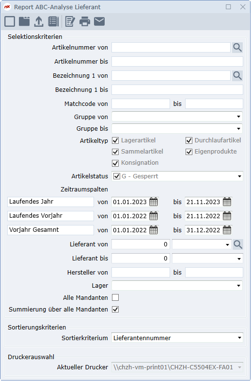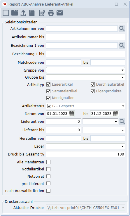 NEXUS / MATERIAL NEXUS / MATERIAL - Handbücher Handbuch MATERIAL NX Auswertungen Reports Einkauf Current: Reports Einkauf ABC-Analyse Reports Einkauf ABC-Analyse ABC-Analyse Lieferant ArtikelFeldgruppe / FeldnameBeschreibungSelektionskriterienArtikelnummerBereich von – bisBezeichnung 1Bereich von – bisMatchcodeBereich von – bisGruppeBereich von – bisArtikeltypAuswahl der Artikeltypen inkl. / ohneArtikelstatusStatus der ArtikelDatumBereich von – bisLieferantBereich von – bisHerstellerBereich von – bisLagerAuswahl eines LagersDruck bis Gesamt-%Berücksichtigt alle Artikel bis zur Erreichung des angegebenen Wertes (50% = Hälfte vom Gesamtbezug, nur die erst rangierten Artikel).Alle Mandanten Ja / NeinNotfallartikel Ja / NeinNotvorrat Ja / Neinpro Lieferant Ja / Neinnach Auswahlkriterien Ja / NeinDruckerauswahlAktueller DruckerAnzeige des aktuellen DruckersBeispiel:ABC-Analyse LieferantFeldgruppe / FeldnameBeschreibungSelektionskriterienArtikelnummerBereich von – bisBezeichnung 1Bereich von – bisMatchcodeBereich von – bisGruppeBereich von – bisArtikeltypAuswahl der Artikeltypen inkl. / ohneArtikelstatusStatus der ArtikelDatum 1Bereich von – bisDatum 2Bereich von – bisDatum 3Bereich von – bisLieferantBereich von – bisHerstellerBereich von – bisLagerAuswahl eines LagersAlle Mandanten Ja / NeinSummierung über alle Mandanten Ja / NeinSortierungskriteriumSortierkriteriumAuswahl zwischen Lieferantennummer, Lieferantenname und WertDruckerauswahlAktueller DruckerAnzeige des aktuellen DruckersBeispiel: ×