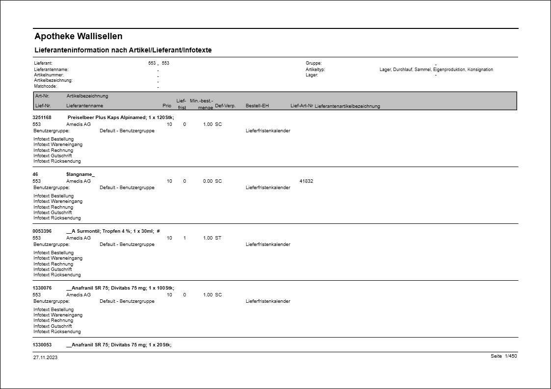 Lieferanteninformation nach Artikel / Lieferant / Infotexte