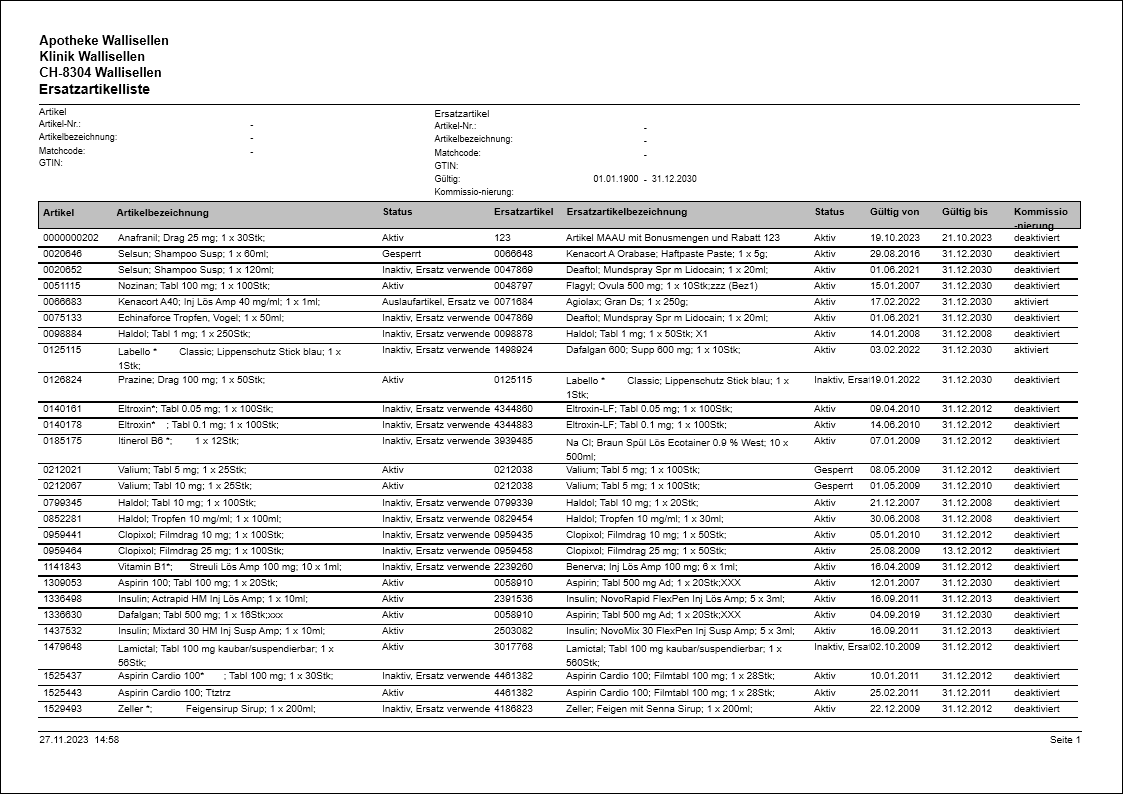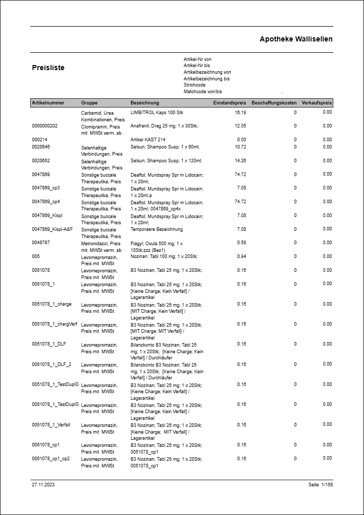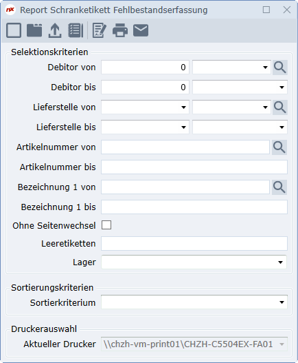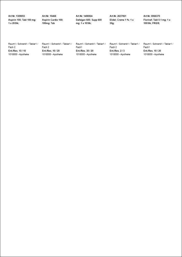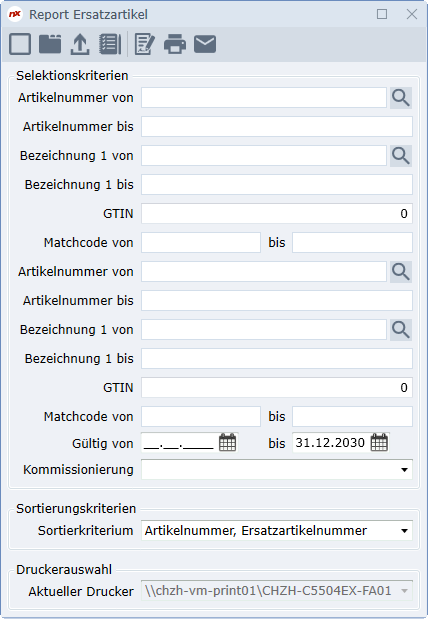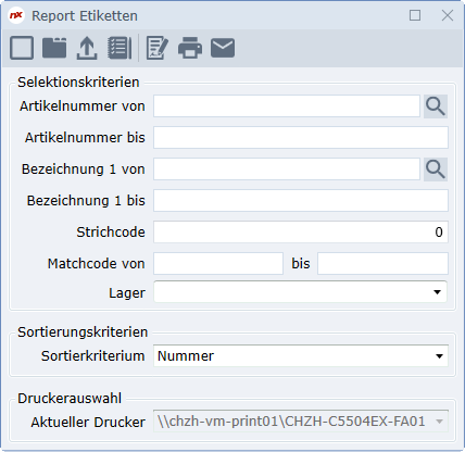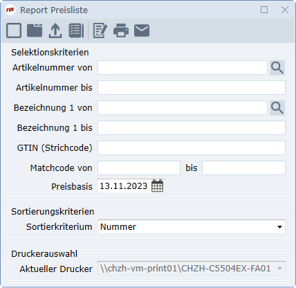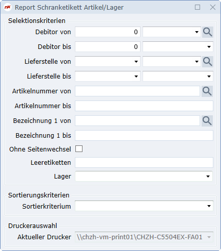 NEXUS / MATERIAL NEXUS / MATERIAL - Handbücher Handbuch MATERIAL NX Auswertungen Report Stammdaten Current: Reports Listen Reports Listen ArtikellisteFeldgruppe/FeldnameBeschreibungSelektionskriterienArtikelnummerBereich von – bisBezeichnung 1Bereich von – bisStrichcodeBereich von – bisMatchcodeBereich von – bisLagerAuswahl eines LagersSortierungskriterienSortierkriteriumAuswahl zwischen Nummer, Bezeichnung und StrichcodeDruckerauswahlAktueller DruckerAnzeige des aktuellen DruckersBeispiel:PreislisteFeldgruppe/FeldnameBeschreibungSelektionskriterienArtikelnummerBereich von – bisBezeichnung 1Bereich von – bisGTIN (Strichcode)Global Trade Item Number zur eindeutigen Identifikation des Artikels, meist in Form eines Barcodes.MatchcodeBereich von – bisPreisbasisDatum, auf das sich die angezeigten Preise beziehen (z. B. gültige Preisliste zum gewählten Datum).SortierungskriterienSortierkriteriumAuswahl zwischen Nummer, Bezeichnung und StrichcodeDruckerauswahlAktueller DruckerAnzeige des aktuellen DruckersBeispiel:EtikettenFeldgruppe/FeldnameBeschreibungSelektionskriterienArtikelnummerBereich von – bisBezeichnung 1Bereich von – bisStrichcodeBereich von – bisMatchcodeBereich von – bisLagerAuswahl eines LagersSortierungskriterienSortierkriteriumAuswahl zwischen Nummer, Bezeichnung und StrichcodeDruckerauswahlAktueller DruckerAnzeige des aktuellen DruckersBeispiel:Schranketikett Artikel/LagerFeldgruppe/FeldnameBeschreibungSelektionskriterienDebitorBereich von – bisLieferstelleBereich von – bisArtikelnummerBereich von – bisBezeichnung 1Bereich von – bisOhne Seitenwechselinkl. / ohne LeeretikettenAuswahl einer LeeretiketteLagerAuswahl eines LagersSortierungskriterienSortierkriteriumAuswahl der SortierungDruckerauswahlAktueller DruckerAnzeige des aktuellen DruckersBeispiel:Schranketikett FehlbestandserfassungFeldgruppe/FeldnameBeschreibungSelektionskriterienDebitorBereich von – bisLieferstelleBereich von – bisArtikelnummerBereich von – bisBezeichnung 1Bereich von – bisOhne Seitenwechselinkl. / ohne LeeretikettenAuswahl einer LeeretiketteLagerAuswahl eines LagersSortierungskriterienSortierkriteriumAuswahl der SortierungDruckerauswahlAktueller DruckerAnzeige des aktuellen DruckersBeispiel:ErsatzartikelFeldgruppe/FeldnameBeschreibungSelektionskriterienArtikelnummerBereich von – bisBezeichnung 1Bereich von – bisGTINAuswahl eines GTIN-CodesMatchcodeBereich von – bisArtikelnummerBereich von – bis (Ersatzartikel)Bezeichnung 1Bereich von – bis (Ersatzartikel)GTINAuswahl eines GTIN-Codes (Ersatzartikel)MatchcodeBereich von – bis (Ersatzartikel)GültigBereich von – bisKommissionierungAuswahl einer KommissionierungSortierungskriterienSortierkriteriumAuswahl der SortierungDruckerauswahlAktueller DruckerAnzeige des aktuellen DruckersBeispiel: ×