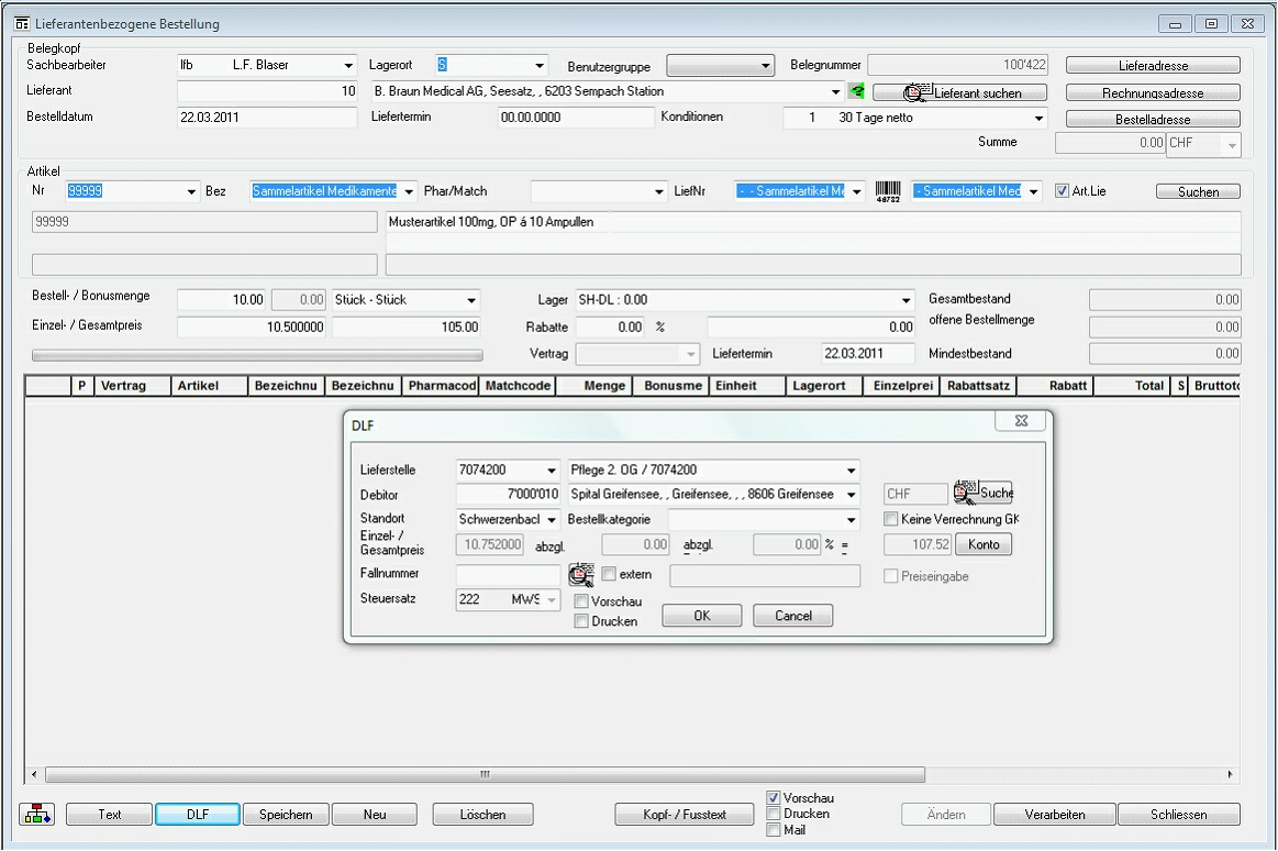 Auch Sammelartikel können auf einen Fall gebucht werden. Bei der Übergabe der Fall-Buchungen an das Patientenmanagement werden zusätzlich der im Beleg erfasste Artikeltext und der erfasste Einkaufspreis (brutto) übergeben. Dies ist erforderlich da Sammelartikel keinen verwendbaren Artikelstammdatensatz vom MatMan liefert. Und damit der PatMan-Leistungskatalogsatz (pat02) nicht für eine Faktura genügt.