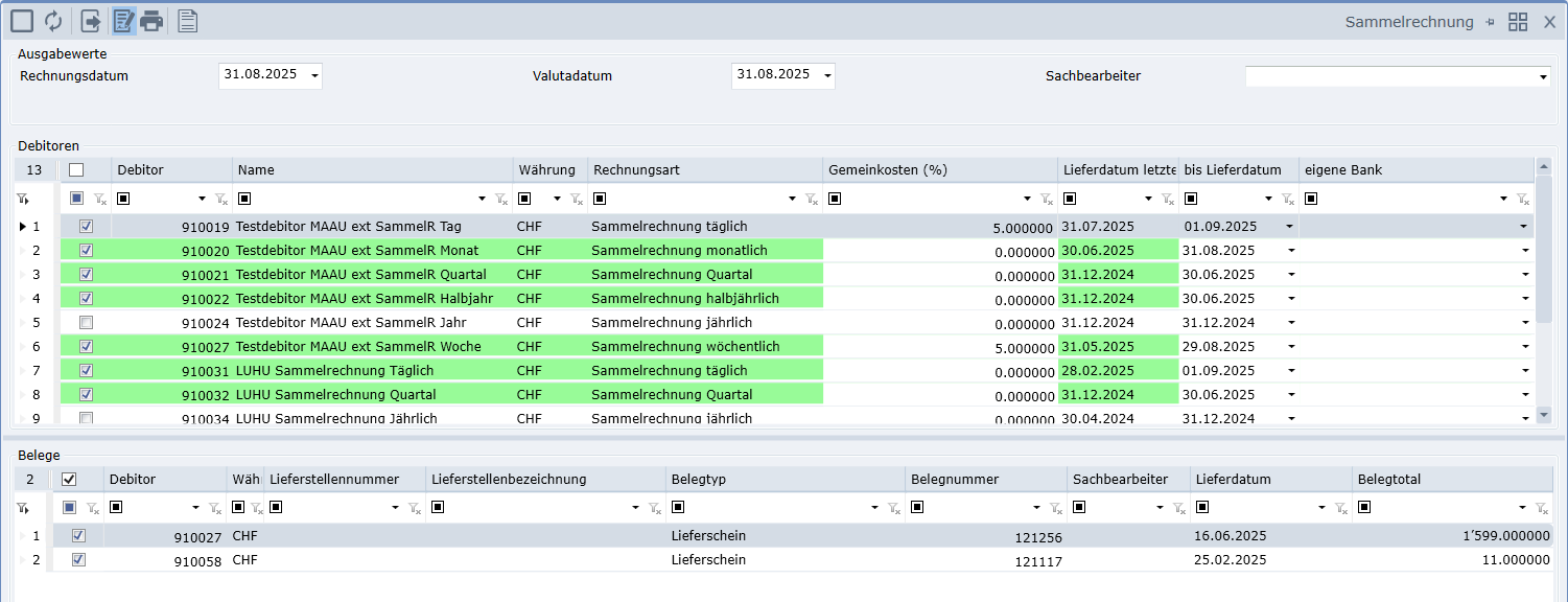 Grid-Bereich | Zeigt alle Debitoren vom Kundentyp 'Extern', die mit der Rechnungsart 'Sammelrechnung ...' gekennzeichnet sind an. Durch aktivieren/deaktivieren der Checkbox am Zeilenanfang, kann eine Auswahl für die Aufbereitung / Anzeige der Belege getroffen werden. |