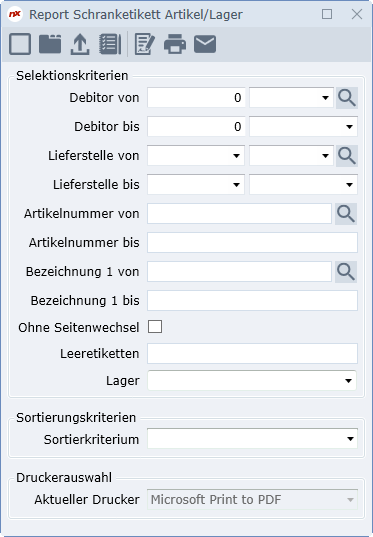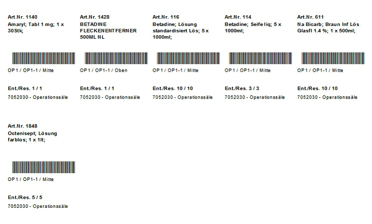 NEXUS / MATERIAL NEXUS / MATERIAL - Handbücher Handbuch Material NX Zusatzmodule Zusatzmodul Stationslagerverwaltung Current: Schranketiketten Schranketiketten Zur Beschriftung der Stationslager kann das Schranketikett eingesetzt werdenEs ermittelt die Mengen aus dem Artikelstamm Reiter Lager des jeweiligen StationslagerDie Abgabeinheit wird ebenfalls aus dem Artikelstamm Reiter Lager ermittelt (1. Priorität)wenn Feld leer > dann vom Reiter Artikel (2. Priorität)wenn leer > dann Basiseinheit (3. Priorität) Damit die Menge in der entsprechenden Abgabeinheit angedruckt werden kann, ist es wichtig in der Selektionsmaske den Lagerort/-pfad zu wählen. >Ansicht >Stammdaten >Listen >SchranketikettBeispiel der Schranketiketten (NEXUS Standard; bei Wunsch kann die Gestaltung angepasst werden) ×