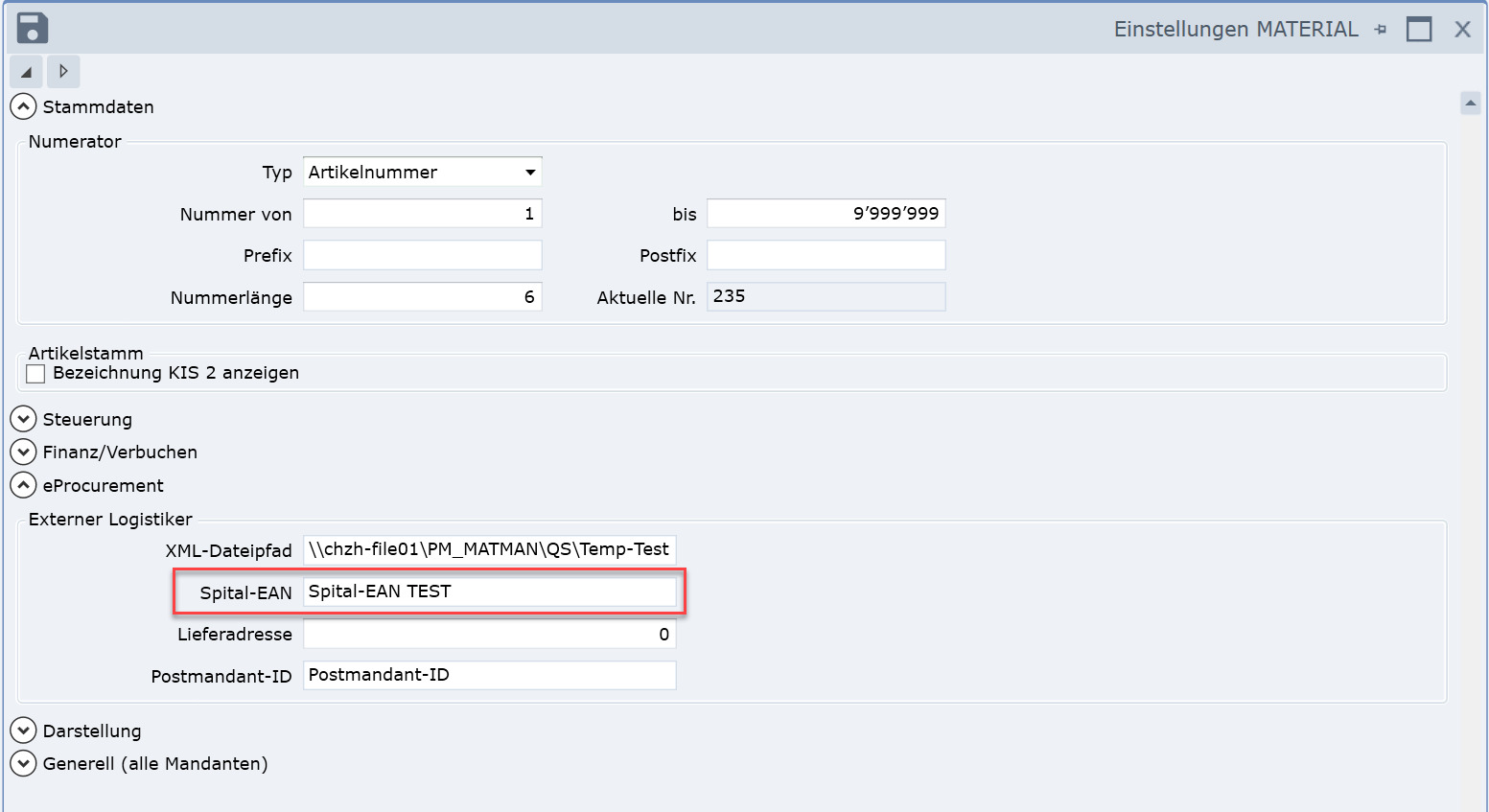 - Bei Spitälern mit nur einem Haus/Standort kann die GLN unter 'Einstellungen MATERIAL' im Bereich eProcurement pro Mandant hinterlegt werden.