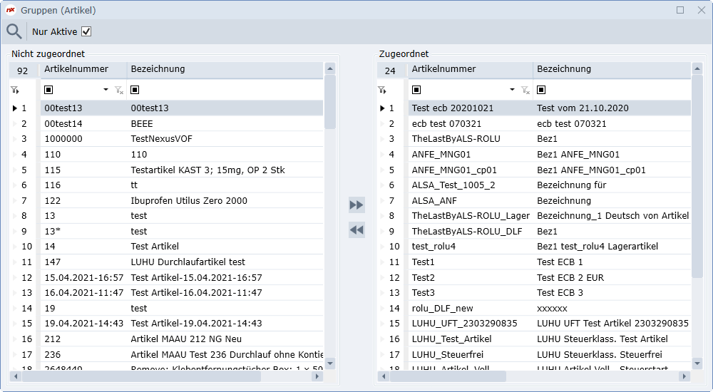 Auf der linken Fensterseite werden die Artikel aufgelistet, die der Gruppe nicht zugeordnet sind. Auf der rechten Fensterseite sehen Sie die Artikel aufgelistet, die der Gruppe zugeordnet sind.