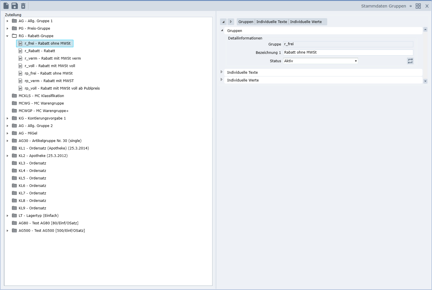 Artikelgruppen sind eine zusätzliche Klassierung der Artikel. Die Artikel können in strategischen Gruppen, resp. Untergruppen zusammengefasst werden. Es sind mehrere Hierarchiestufen innerhalb derselben Artikelgruppe möglich. Auch können mehrere unterschiedliche Artikelhauptgruppen (AG1, AG2 etc.) gebildet werden. Der Gruppenname wie z.B. «Ordersatz» kann im Systemmanagement umbenannt werden. Bitte sprechen Sie gewünschte Namensänderungen immer zuerst mit uns ab, damit wichtige Funktionalitäten nicht beschränkt werden.
