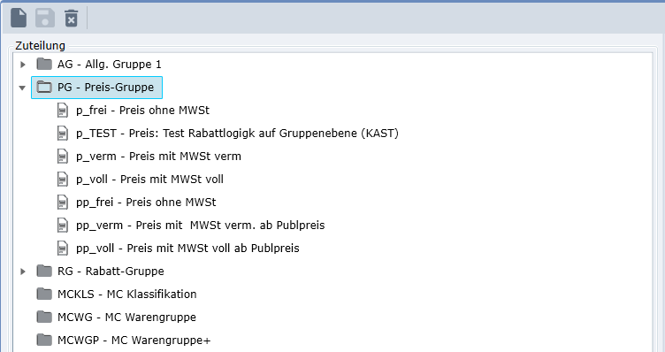 Auf der linken Bildschirmseite werden die bereits angelegten Gruppen in einer Baumstruktur dargestellt. Die Baumstruktur kann nur eine oder aber auch mehrere Hierarchiestufen enthalten. Die Oberste Gruppenstruktur ist vorgegeben und kann nur mit dem Programm «Systemmanagement» geändert werden.