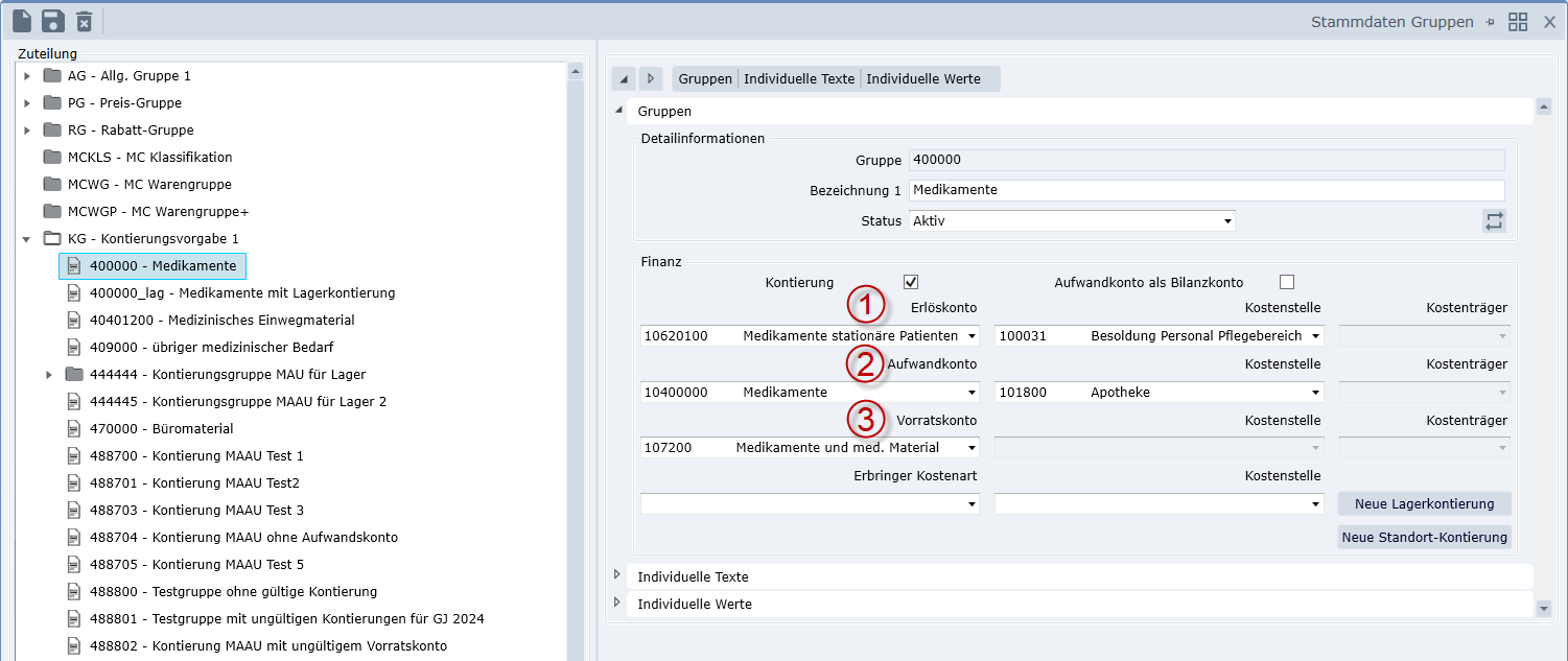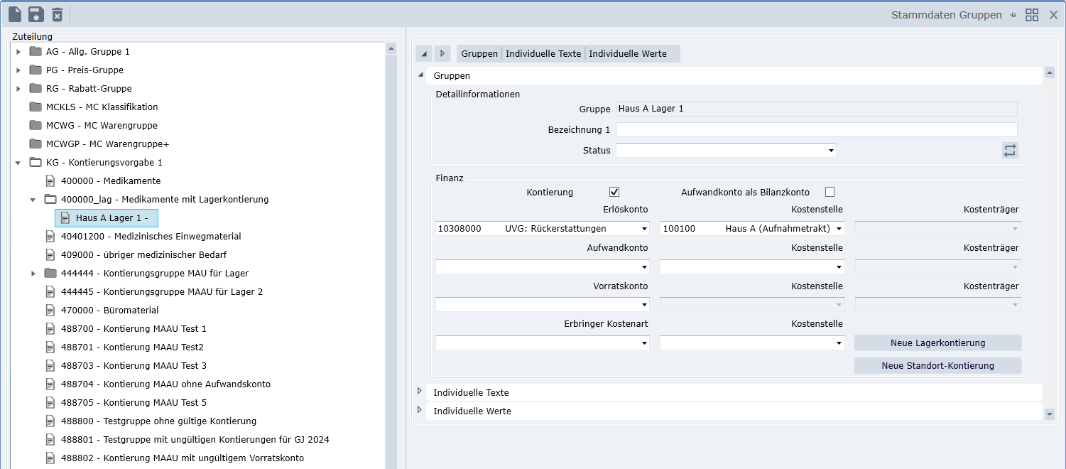 Die Lagerkontierung kann dann eingesetzt werden, wenn pro Lagerbereich andere Konten und/oder Kostenstellen bebucht werden sollen. Bei der Lagerkontierung besteht die Möglichkeit zu einer bestehenden Hauptgruppe, Untergruppen pro Lager mit der jeweiligen Kontierungsregel zu hinterlegen. Die Kontierungsregel der Hauptgruppe wird bei der Belegerfassung (Einkauf, Verkauf, Lagerumbuchung) immer dann gezogen, wenn es keine Untergruppen zu einem bestimmten Lager vorfindet.