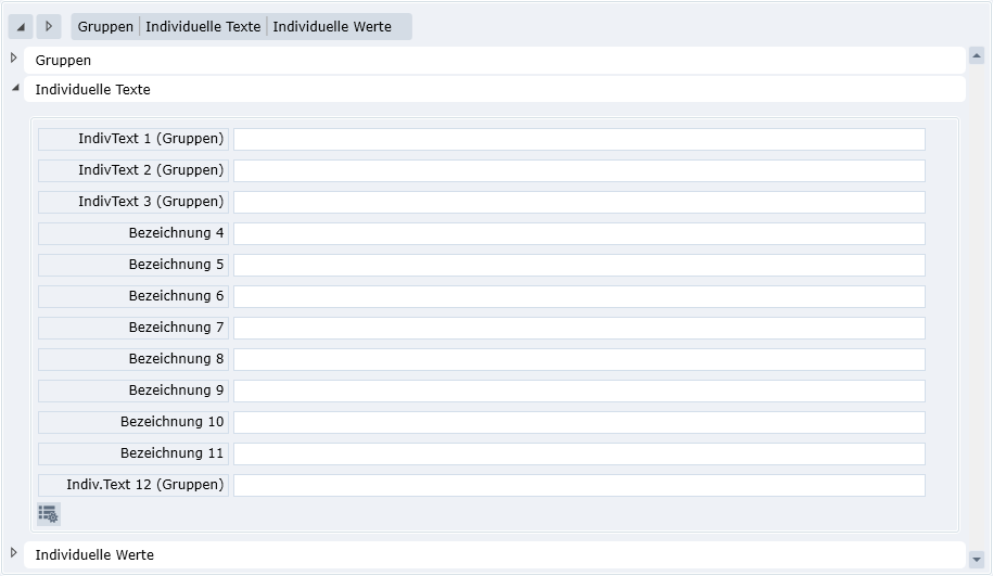 Es stehen Ihnen 12 Felder zur Verfügung, die Sie für Ihre Zwecke nutzen können. Das Register Individuelle Texte ist rein informativ und übernimmt im Materialmanagement keine weiteren Funktionen.