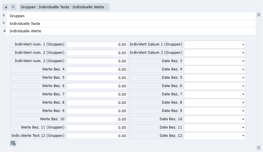 Es stehen Ihnen 12 Felderpaare zur Verfügung, die Sie für Ihre Zwecke nutzen können. Jedes der 12 Felderpaare besteht aus einem Numerischen- und einem Datumsfeld. Das Register Individuelle Werte ist rein informativ und übernimmt im Materialmanagement keine weiteren Funktionen.