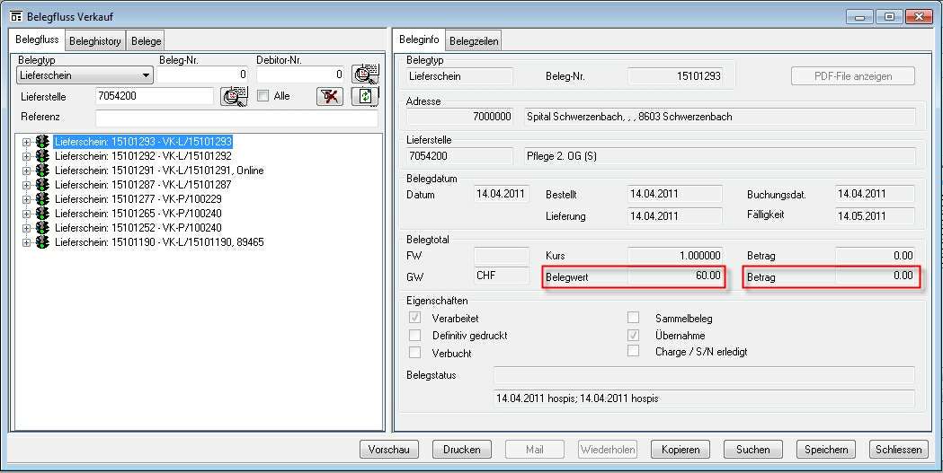 - Der Belegwert eines Umlagerungsbeleges (Lieferscheinbuchung an ein Stationslager) ist i.d.R. = 0.00.
