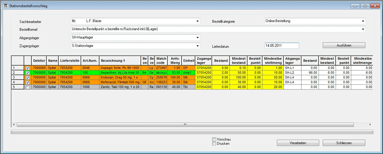 - Generierung eines Bestellvorschlages für Stationen, aufgrund aktueller Lagerbestand und definierten Mindestbestand