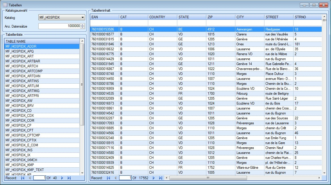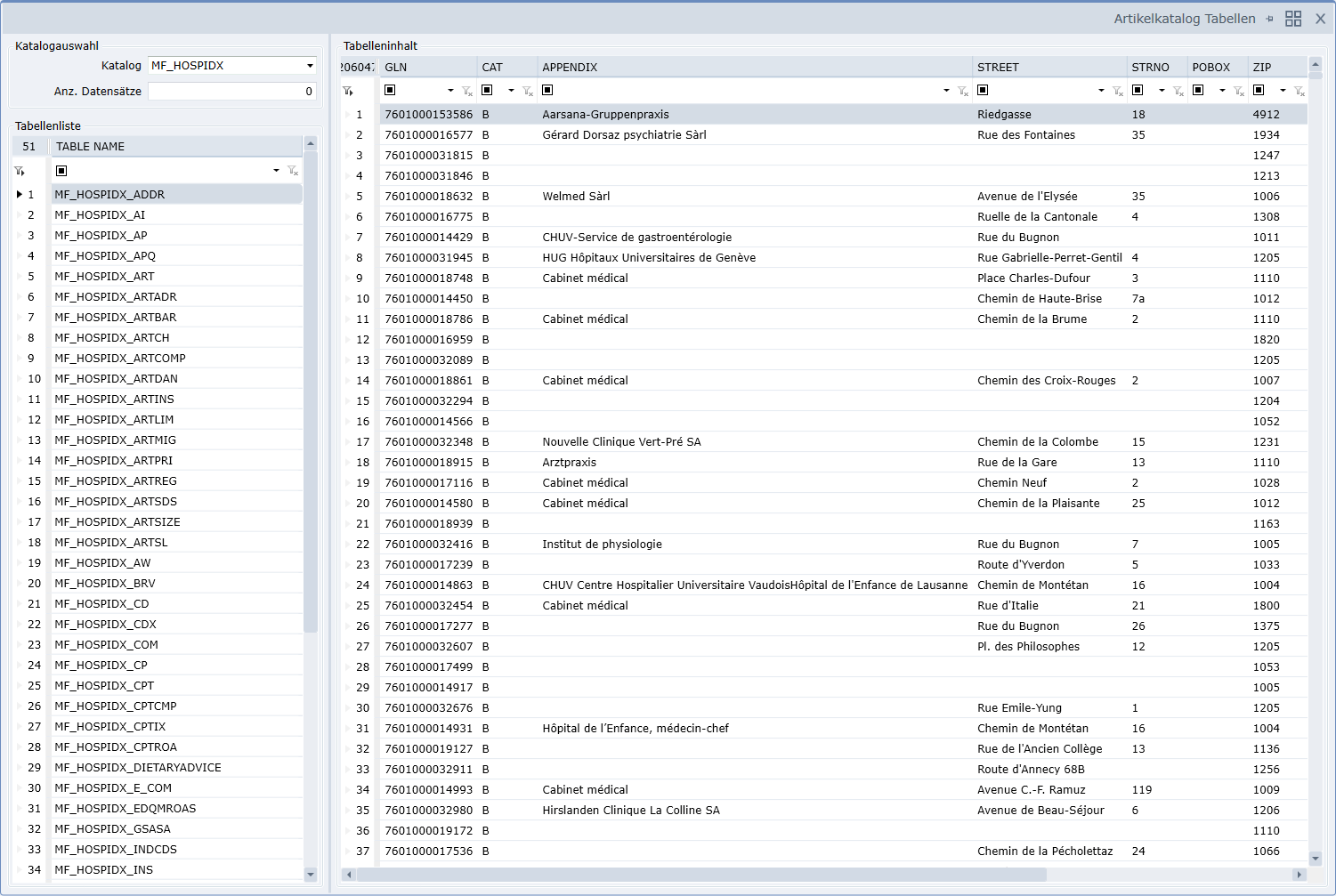 >Extras >Tabellen Hier hat man Einblick in sämtliche Tabellen, Tabellenfelder inkl. Dateninhalt des Artikelkataloges (hospINDEX). ACHTUNG: Es hat zum Teil sehr viele Datensätze pro Tabelle. Aus Performancegründen kann die Anzeige der max. Anzahl Datensätze beschränkt werden; siehe Einstellungen für Vorbelegung bzw. Feld „Anz. Datensätze“.