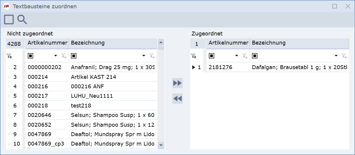 kann der gewählte Textbaustein schnell einem oder mehreren Artikeln gleichzeitig zugewiesen werden. Eine Entfernung von Textbausteinen bei Artikeln ist ebenfalls über die Pfeiltaste in umgekehrter Richtung möglich.