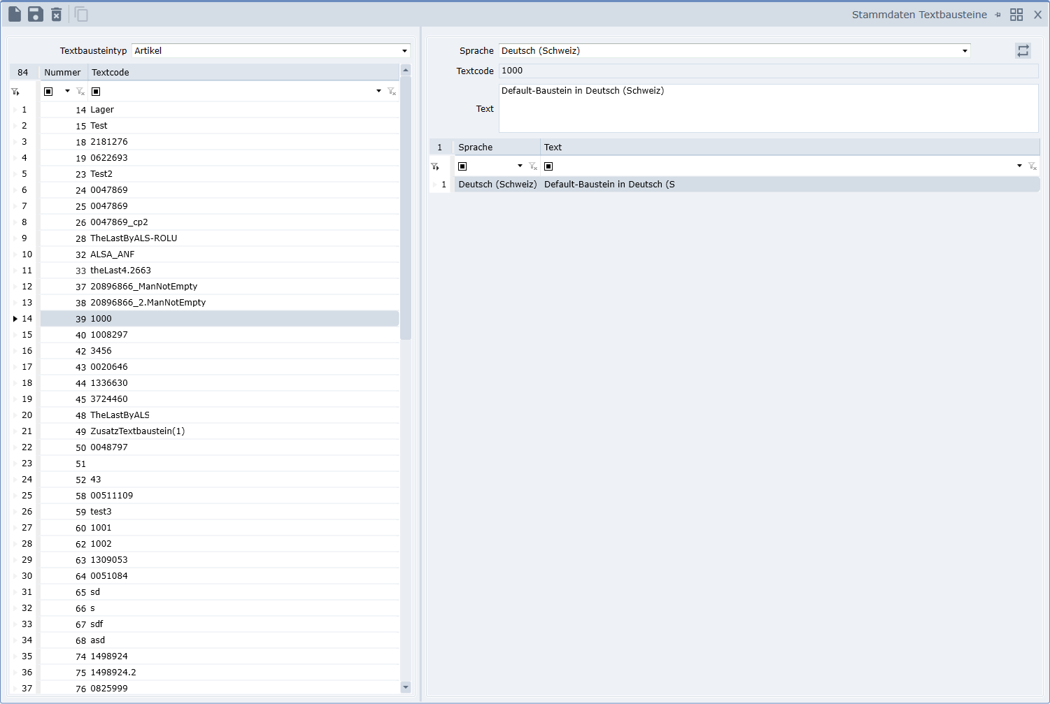 Die Schaltfläche, neben dem Feld «Sprache» öffnet den Dialog 'Textbausteine zuordnen'. Auf der rechte Seite werden die zugeordneten und auf der linken, die noch nicht zugeordneten Artikel für den gewählten Textbaustein angezeigt. Mit der Pfeiltaste
