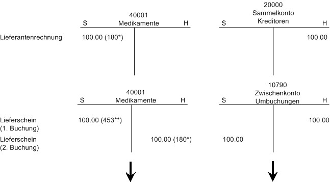 Die Verbuchung der Lieferantenrechnungen erfolgt in der Regel im Soll auf das Warenvorratskonto und im Haben auf das Sammelkonto Kreditoren. Die Verbuchung der Abgänge belastet ein Aufwandskonto/Kostenstelle im Soll und im Haben das Warenvorratskonto.