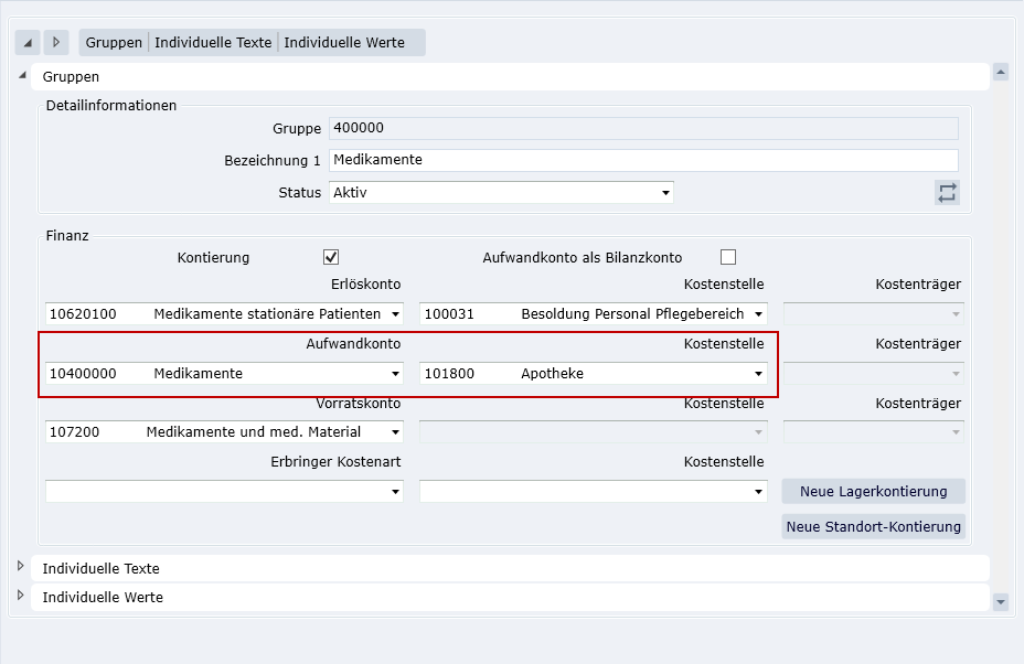 Aufwandskonto | 40001 Medikamente | Kontierungsvorgabe1/Artikel |