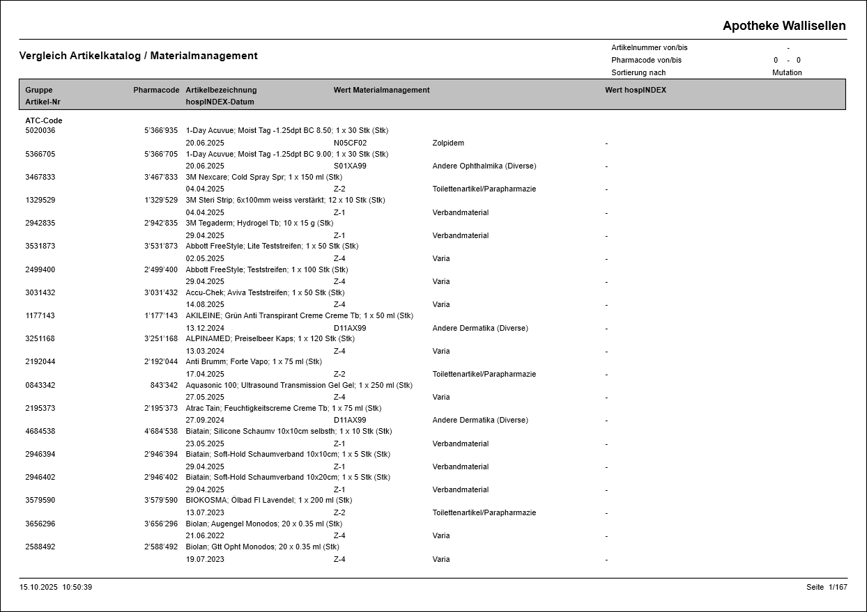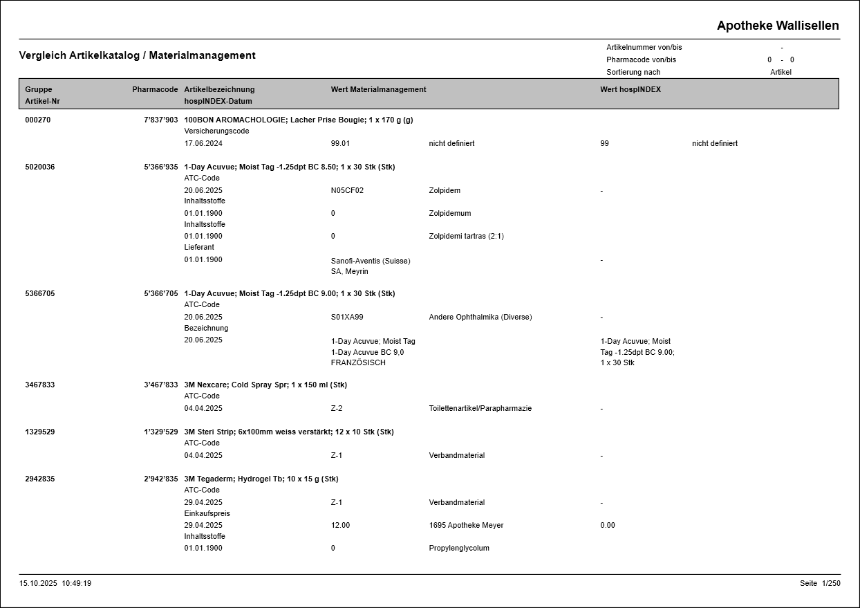 Diese Liste vergleicht die aktuellen Daten des Artikelstamms aus dem Materialmanagement mit den aktuellen Daten aus dem hospINDEX und protokolliert Unterschiede.