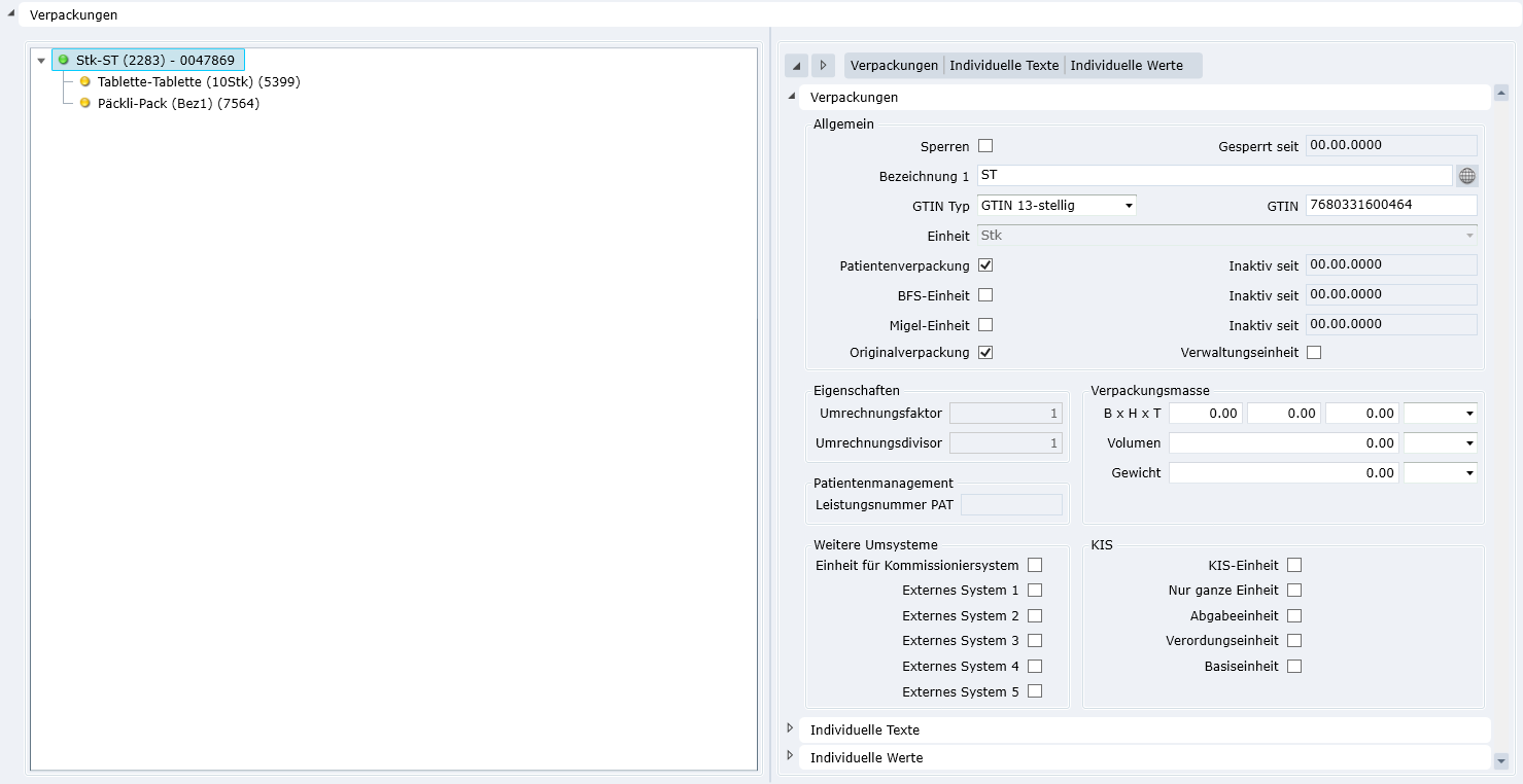 | Sperren | Aktives Kontrollkästchen sperrt die angewählte Verpackungseinheit |