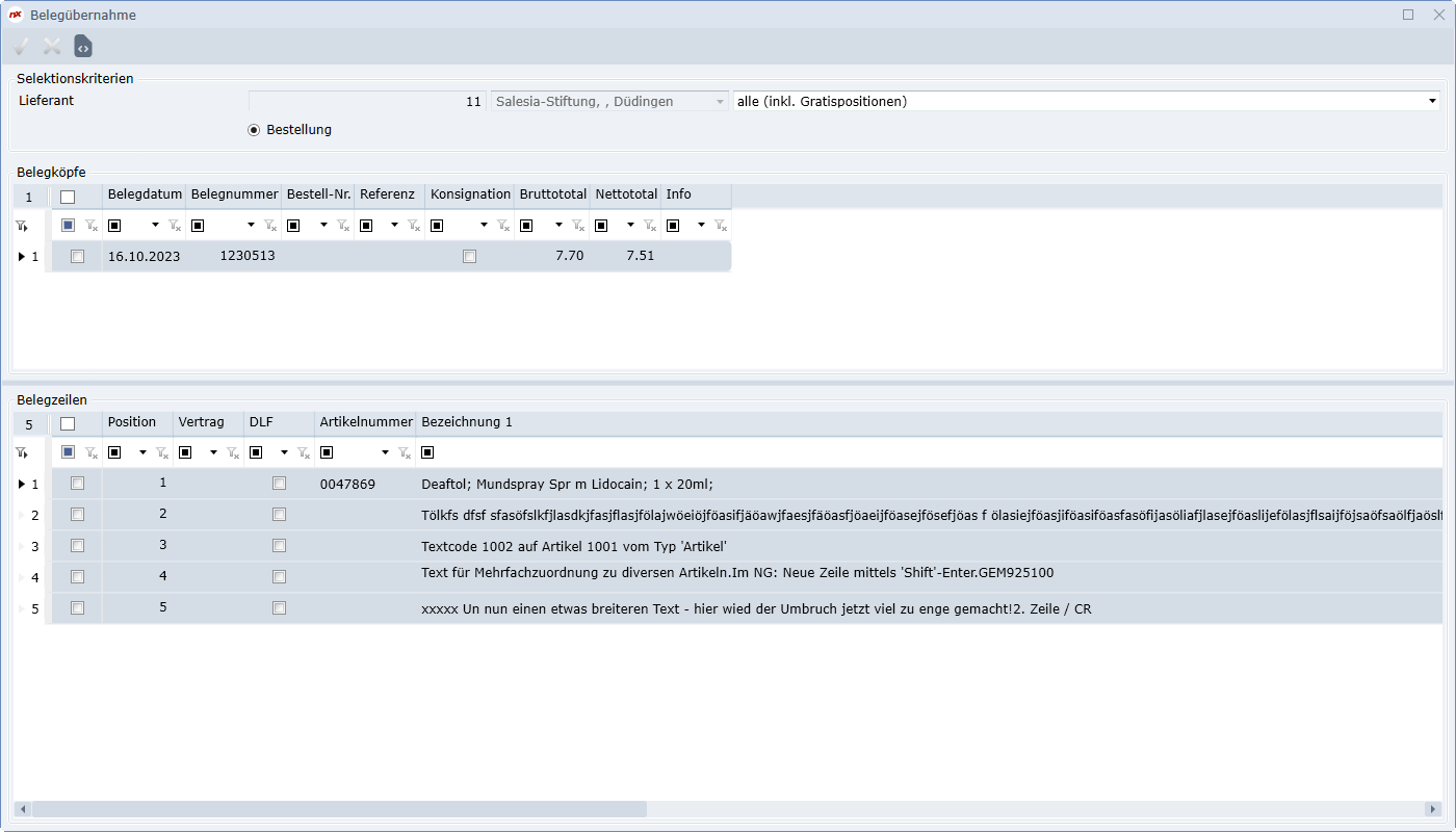 Lieferdatum | Vorschlag Tagesdatum, kann manuell mit dem effektiven Datum der Lieferung überschrieben werden; gilt für alle Positionen des Beleges. |