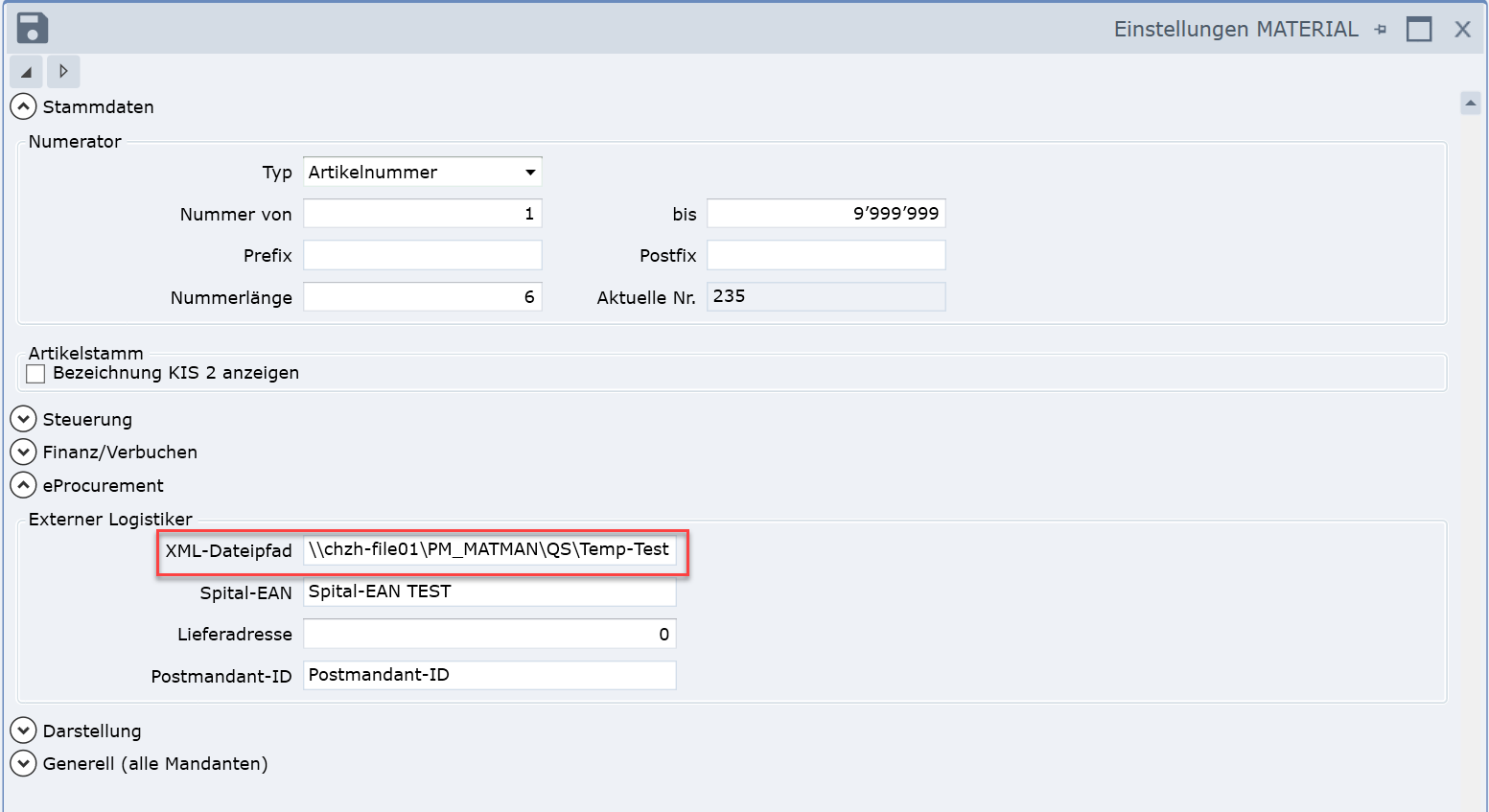 Sollen neben den XML-Files die Bestellungen als Datei abgelegt werden, so kann unter Plugin 'Einstellungen MATERIAL' im Bereich eProcurement ein Pfad im Feld "XML-Dateipfad" hinterlegt werden.