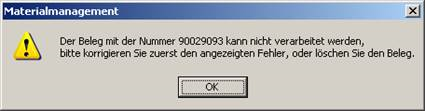 Auf Belege mit fehlerhaften Zeilen wird beim „Verarbeiten“ mit folgender Meldung hingewiesen: